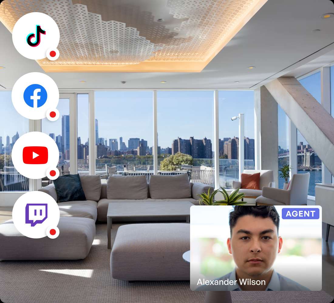 Stream your video tours to thousands of users live using Roomcast Streams. Soon you will be able to stream your content to multiple social media platforms at once.